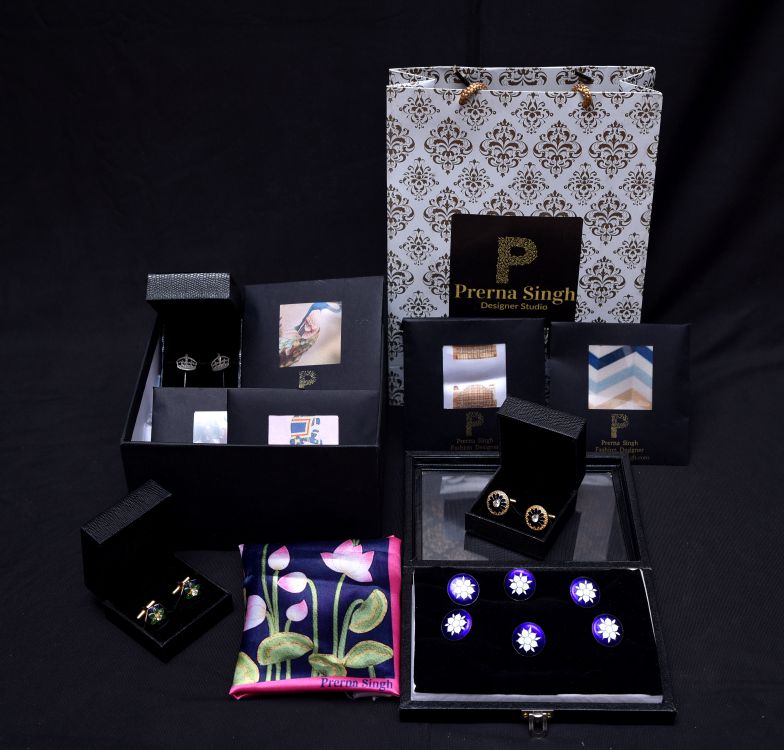 custom _ made accessories for men , customize your hamper with sterling silver buttons with cufflink and set of pocket squares